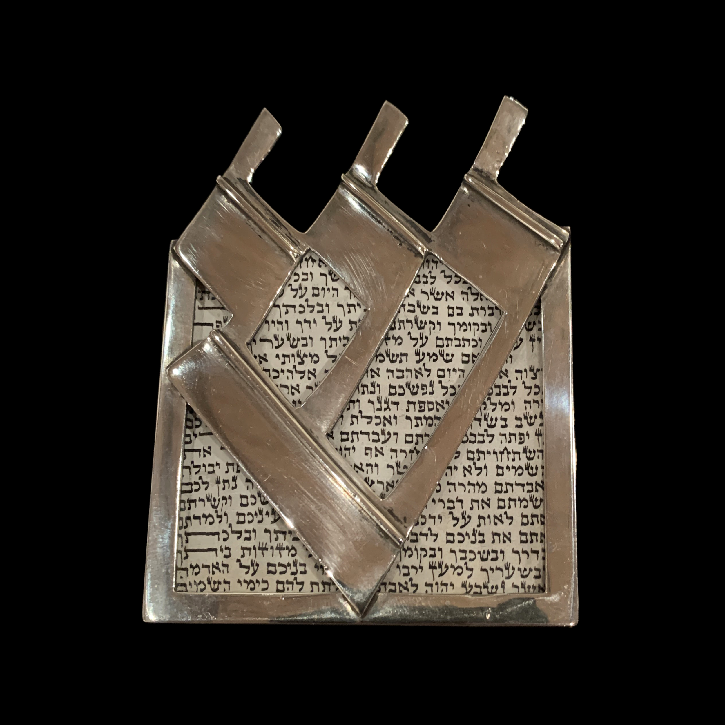 Description: Silver Mezuzah, Modern Mid Century design. Large Shin with open parchment exposed to the viewer