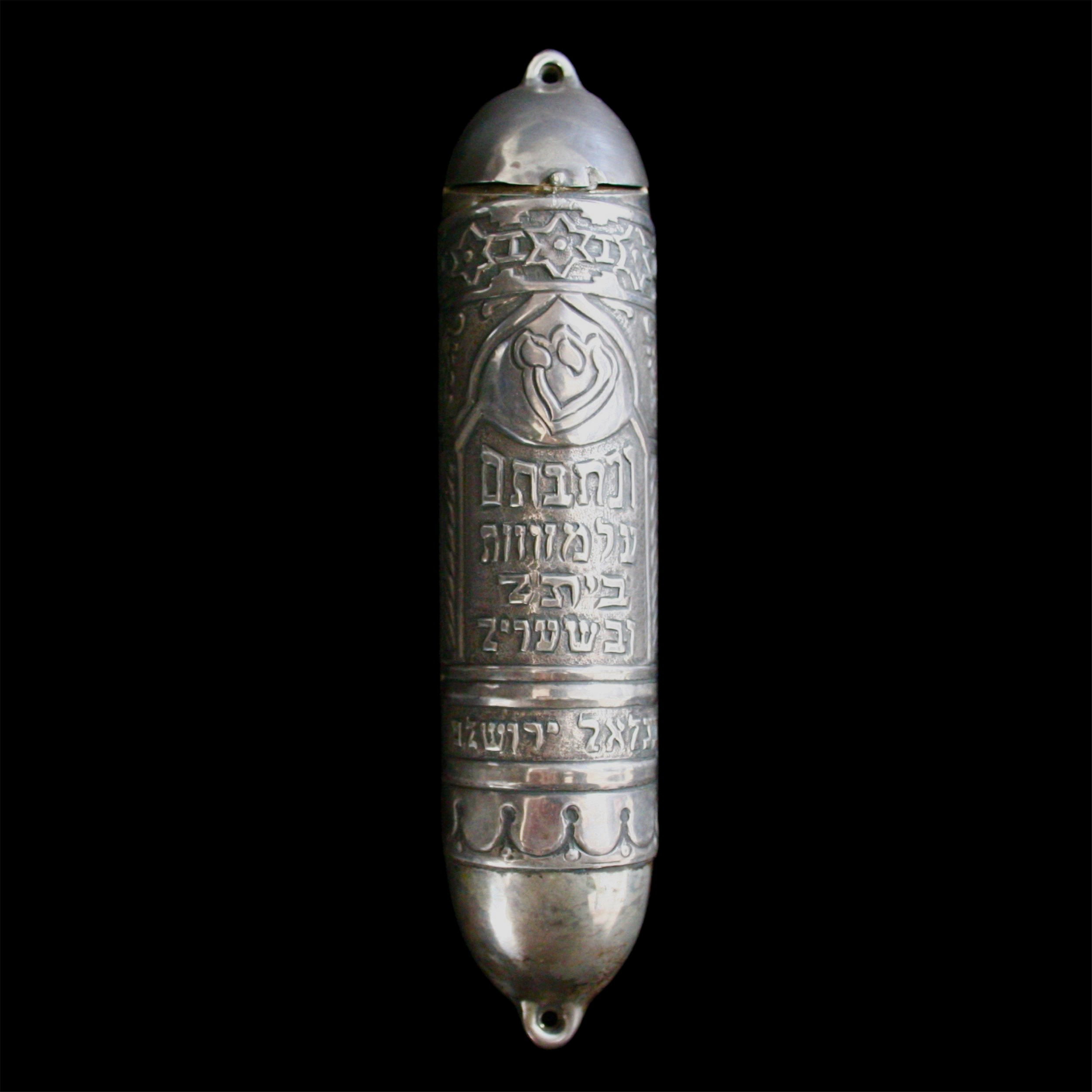 Description: Large silver Mezuzah inspired (see A217) by Bezalel mezuzah from the 1920's. Finely hand wrought and chased in typical Bezalel style. Centering shin and below is Hebrew calligraphy bearing "and you shall write them upon the doorsteps of your house and upon your gateways". Lid at top opens for parchment placement
