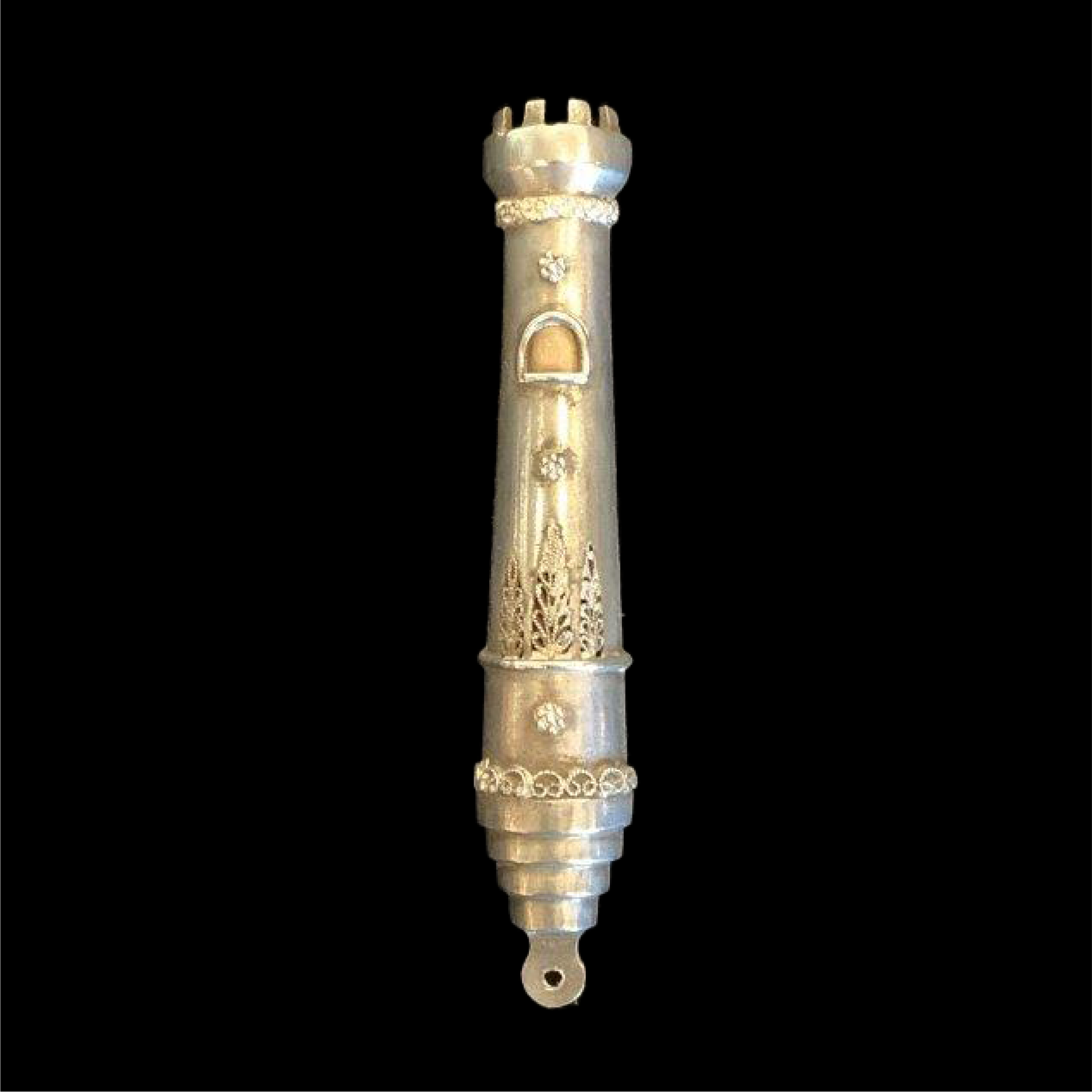 Description: Silver cast Mezuzah in the shape of a castle turret. Filigree wire design on front with a small opening to reveal the original parchment.