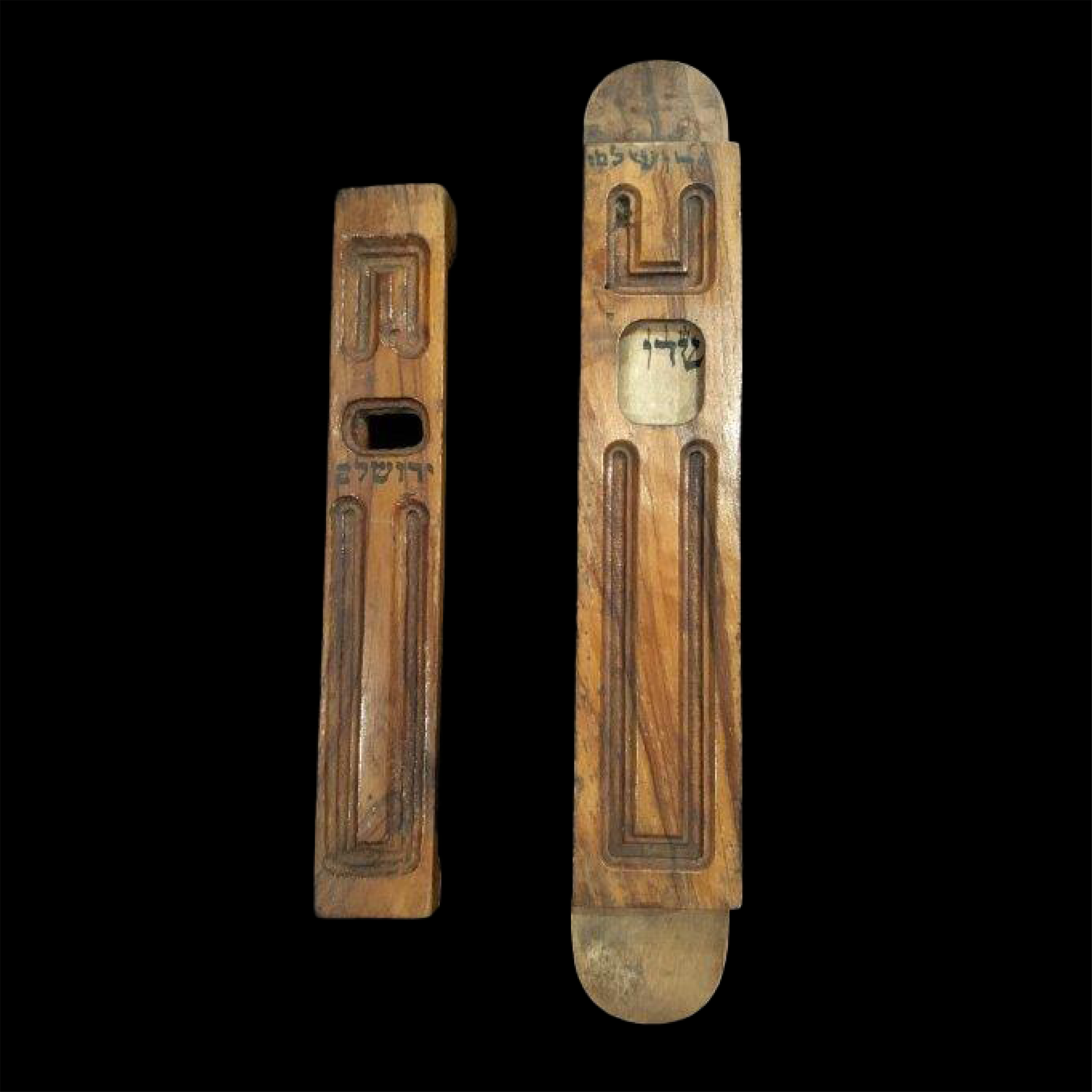 Description: Two carved Olive Wood Mezuzahs, routed out design with opening for Parchment display. Larger one revealing original hand-inked Shaddai.